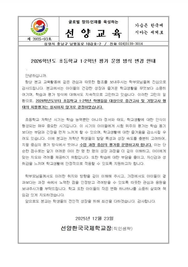 | [Ãʵî] 2026Çг⵵ ÃʵîÇб³ 1¡¤2ÇÐ³â Æò°¡ ¿î¿µ ¹æ½Ä º¯°æ ¾È³» | |