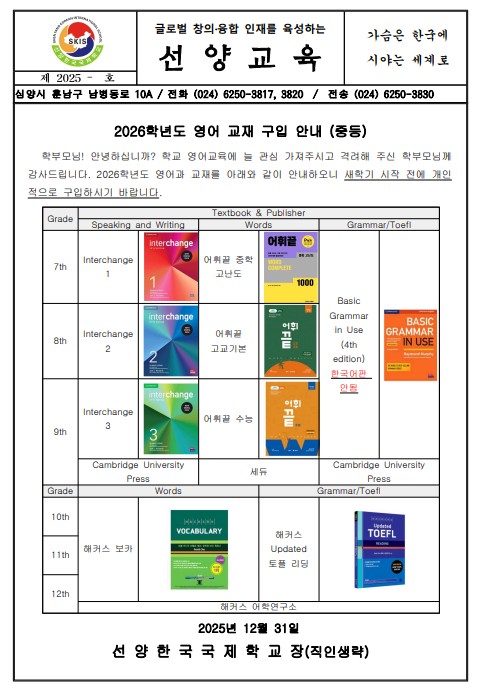 | [Áßµî-°¡Á¤Åë½Å¹®] 2026Çг⵵ Áßµî ¿µ¾î ±³Àç ¾È³» | |