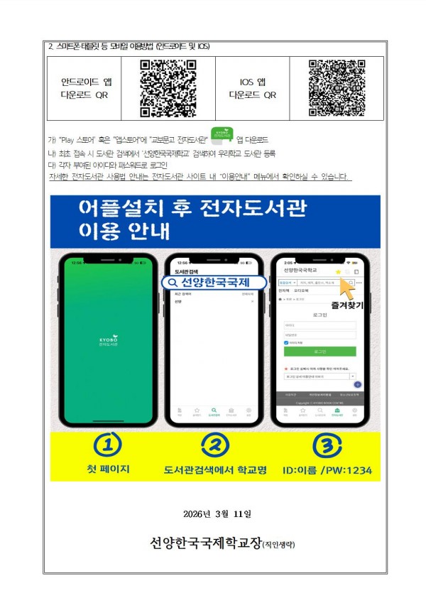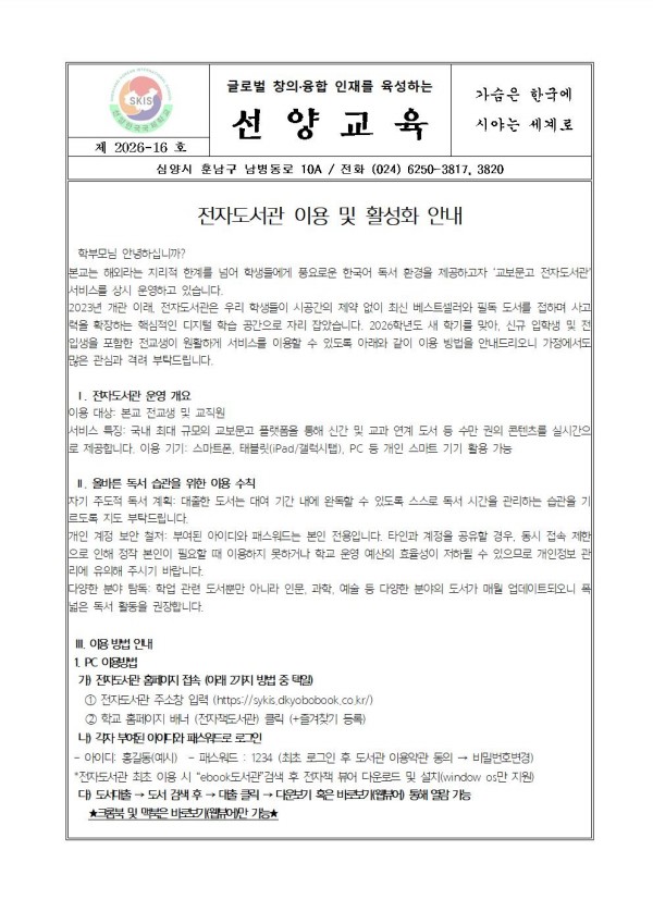 Çкθð´ÔÀÇ ±íÀº °ü½É¿¡ °¨»çµå¸³´Ï´Ù. º»±³´Â ÇØ¿Ü¿¡¼µµ ÇлýµéÀÌ Çѱ¹ µµ¼¸¦ ½±°í ÆíÇÏ°Ô Á¢ÇÏ¸ç »ç°í·ÂÀ» È®ÀåÇÒ ¼ö ÀÖµµ·Ï ÀüÀÚµµ¼°üÀ» »ó½Ã ¿î¿µÇϰí ÀÖ½À´Ï´Ù. 2026Çг⵵ »õ Çб⸦ ¸Â¾Æ, ½ÅÀÔ»ý°ú ÀçÇлý ¸ðµÎ°¡ ½Ã°ø°£ÀÇ Á¦¾à ¾øÀÌ ¾çÁúÀÇ µ¶¼ Ȱµ¿À» À̾ ¼ö ÀÖµµ·Ï ÀÌ¿ë ¹æ¹ýÀ» ¾È³»ÇØ µå¸³´Ï´Ù. ÀÚ³àÀÇ ¿Ã¹Ù¸¥ µ¶¼ ½À°ü Çü¼º°ú âÀÇÀû ¼ºÀå¿¡ µµ¿òÀÌ µÇ´Â ¼ÒÁßÇÑ ½Ã°£ÀÌ µÇ±æ ¹Ù¶ø´Ï´Ù.